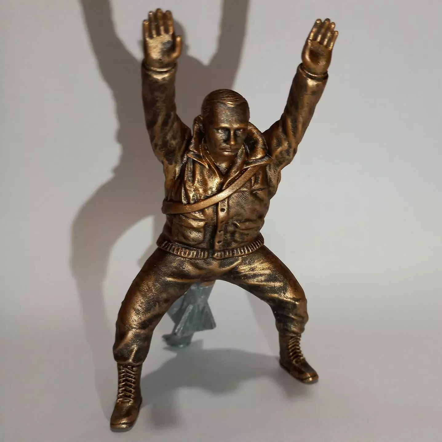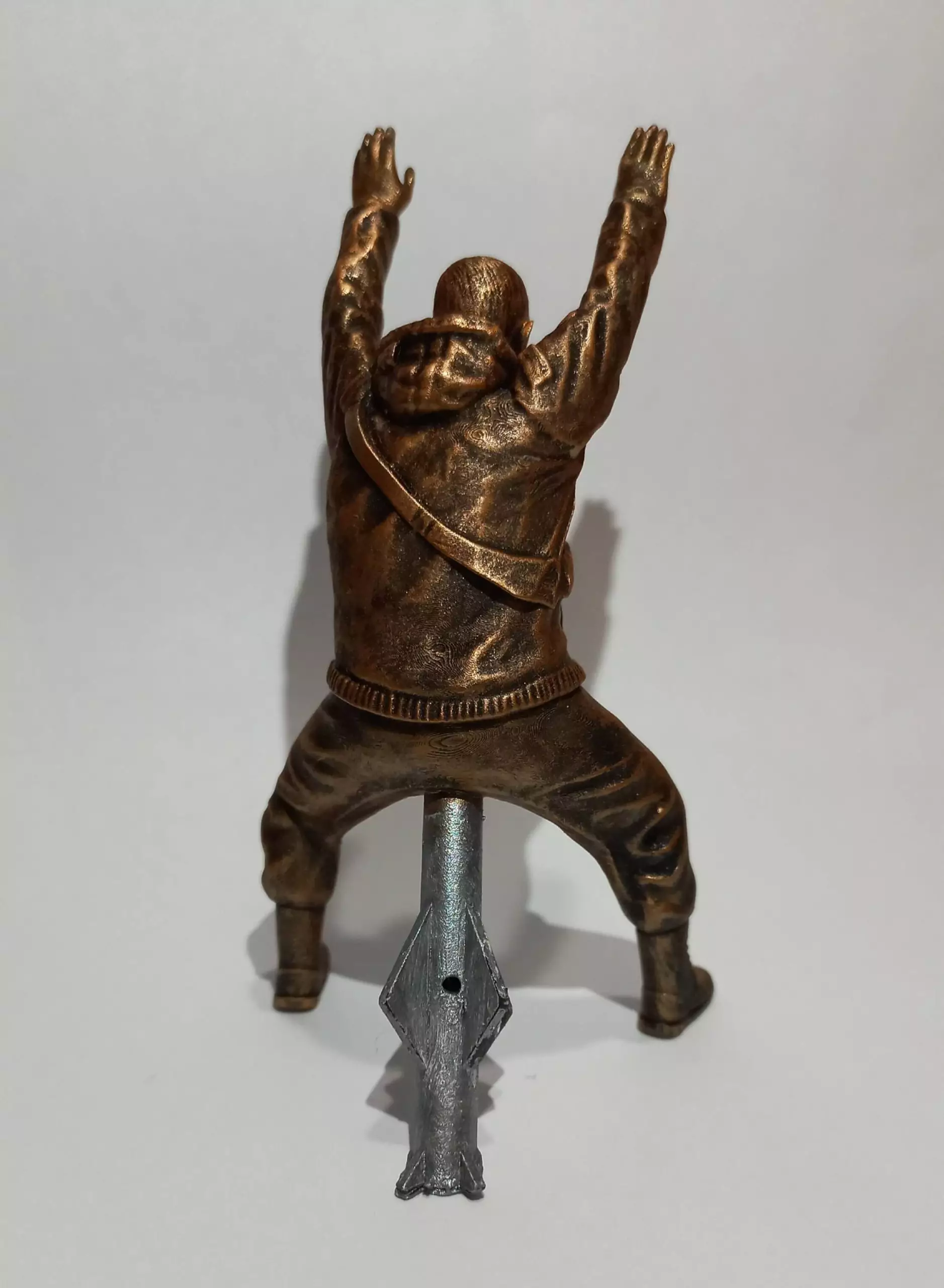 Статуетка є високоякісним виробом з полімерної смоли, виготовленим у вигляді мініатюрної фігурки володимира путіна, який тримає ракету в своєму задньому проході. Висота статуетки становить 10 см, а колір виконання нагадує стару мідь, що надає їй особливої естетичної привабливості. Ця статуетка може бути використана як прикраса для столу, полиці, або в якості унікального подарунка для друзів та знайомих. Слава Україні!